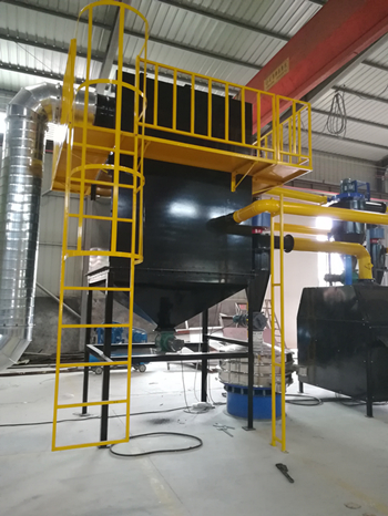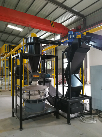 由輸送機將物料送入一級破碎機中進行粗破碎,粗破碎后的物料再通過輸送機送入二級破碎機中進行第二次破碎,二級破碎機破碎后的物料進入到輸送機中同時設(shè)置磁選設(shè)備,可以將物料中的鐵分選出來。物料輸送機和磁選器去除鐵后,進入到三級破碎機中進行細(xì)破碎,將物料破碎至粉末。粉末狀態(tài)的物料由負(fù)壓系統(tǒng)進入到旋風(fēng)分離器中進行空氣過濾,并通過風(fēng)機落至氣流分選機上,由氣流分選機分選,使不同密度的物質(zhì)進行分層,最后得到金屬分選出來,而所有的非金屬由負(fù)壓系統(tǒng)帶入脈沖除塵器進行集中。而過濾得到的尾氣將繼續(xù)由負(fù)壓系統(tǒng)送入到尾氣處理設(shè)備中進行空氣凈化,使之達(dá)到國家排放標(biāo)準(zhǔn)后再進行高空排放。