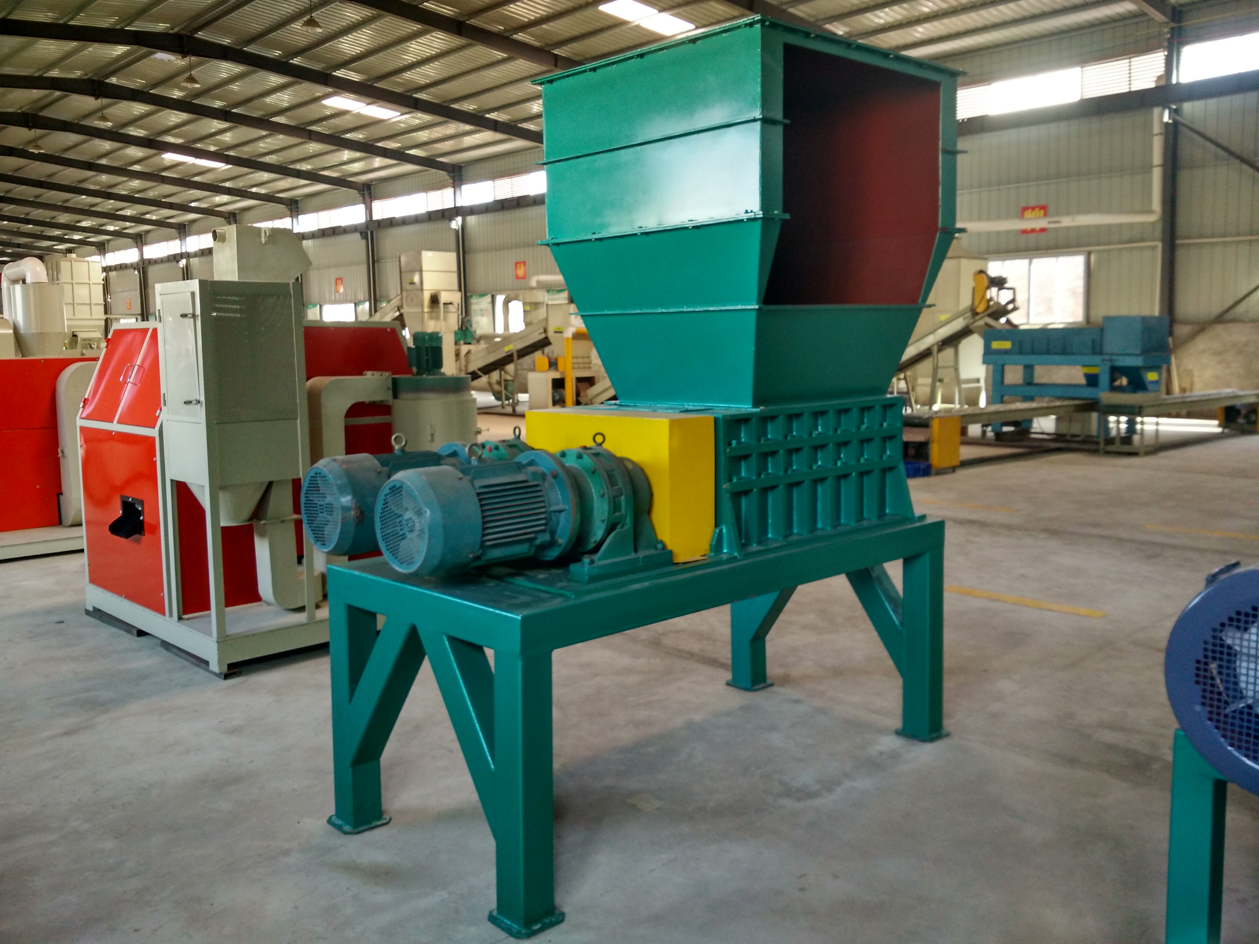 該機設計新穎、噪音低、扭矩大、用途廣,在破碎過程中,具有拉切、扯斷、擠壓、自動退料,能使各種塑料、廢電線、電纜、印刷電路板、廢舊冰箱、洗衣機、空調、電視、電腦等家電及打印機、復印機、傳真機等辦公用品。廢舊橡膠、工程樹脂、城市廢物、木材、管材、粗大塊料破碎之用,每小時處理量1-10噸。