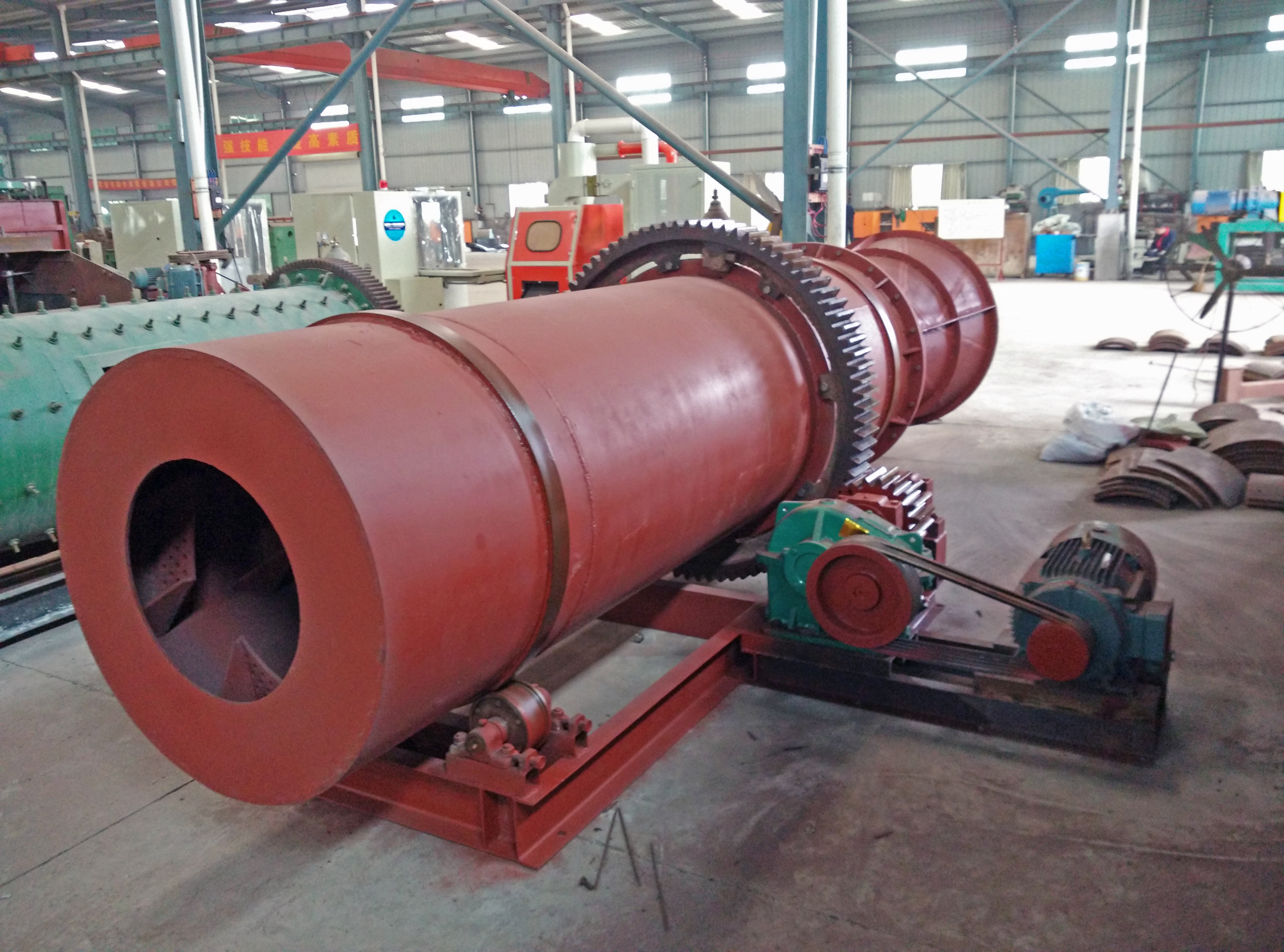 圓筒洗礦機(jī)工作同體用四個(gè)滾輪支撐,電機(jī)帶動(dòng)減速器,大小齒輪使工作筒體低速旋轉(zhuǎn)。含有泥雜質(zhì)的礦石物料從進(jìn)料口給入,進(jìn)入旋轉(zhuǎn)的工作筒體內(nèi),被工作筒體內(nèi)安裝有一定角度導(dǎo)料板不斷帶起拋落,自進(jìn)料端到出料端移動(dòng)過(guò)程中多次循環(huán),并被逆向沖洗水流沖涮洗滌。沖洗干凈的礦石物料經(jīng)提升器提升卸入單層或多層錐形篩,分篩成粗、中、細(xì)三個(gè)粒級(jí)分別排出,含有污泥雜質(zhì)的廢水則通過(guò)給料端檔板流出。