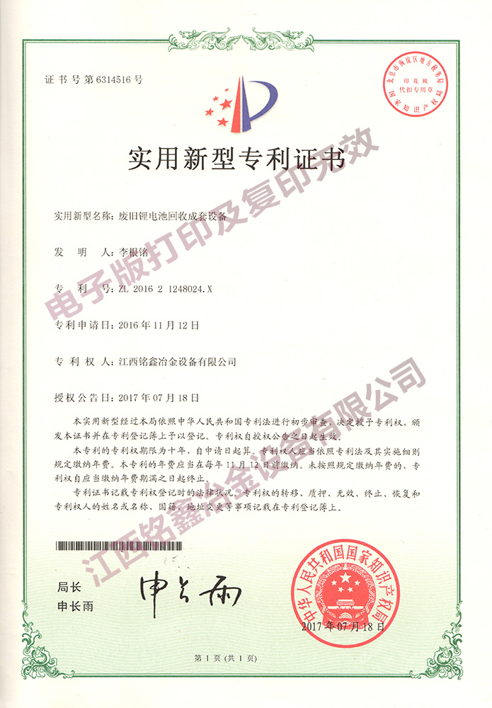 • 廢舊鋰電池回收成套設(shè)備-ZL201621248024.X