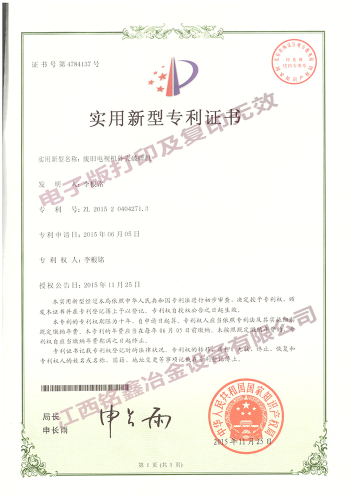 • 廢舊電視機(jī)外殼破碎機(jī)- ZL201520404271.3